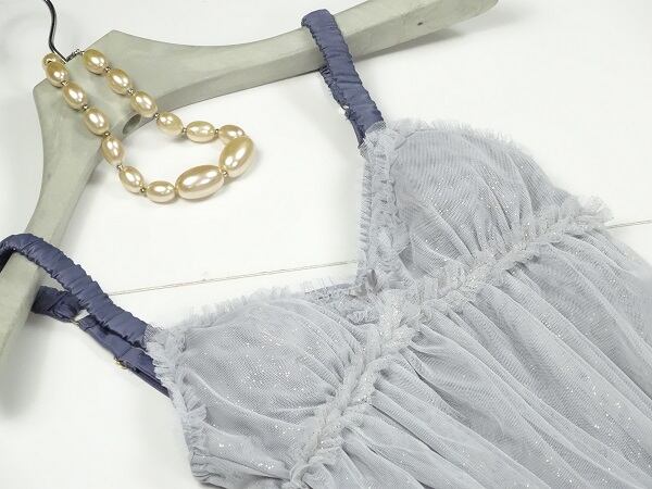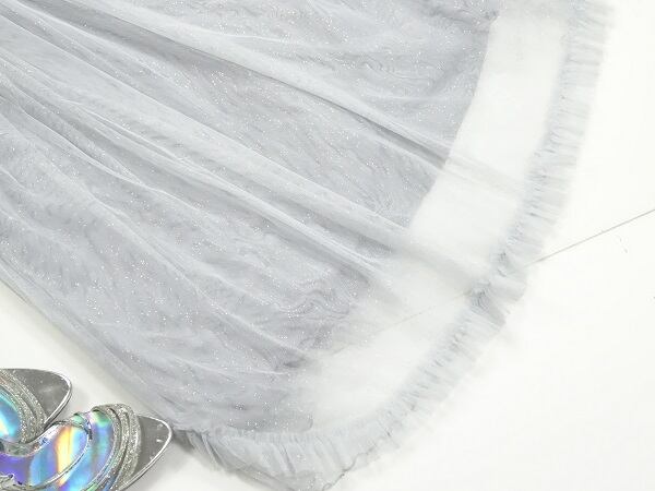 艶のあるサテン生地の上にふわっとしたメッシュがかかっていて豪華な印象になっています。リゾート地でカジュアルに、またパーティや結婚式、コンサートなど、様々なシーンで活躍してくれる一着です。ファスナーなし。裏地有り。