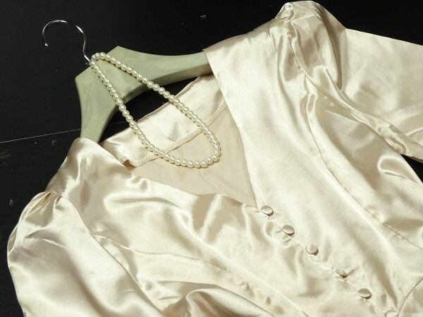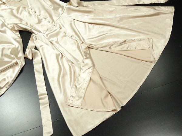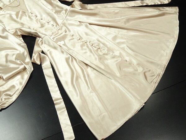 光沢ゴールドV字ネック大人のワンピースです。胸元はV字カットで大人の魅力を表現。光沢感のあるゴールドがやさしい印象を与えてくれる一着です。前ボタン有。裏地なし。同布ベルト付き。