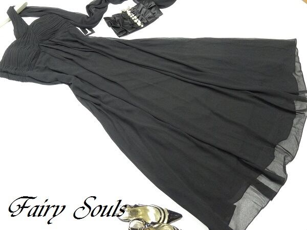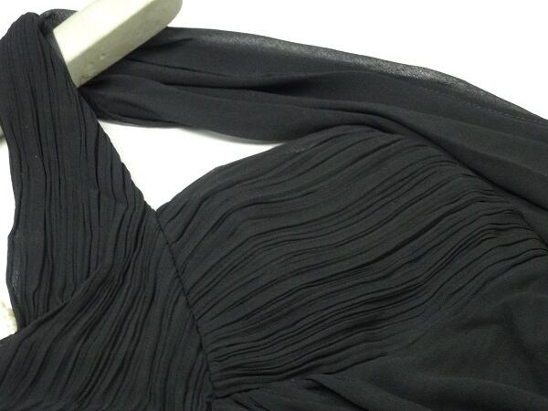 シックな黒のワンショルダーのロングドレス。落ち着いた黒のシフォン地をたっぷり使用した豪華でデザイン性のあるスタイルがとても魅力的な一着です。胸元を細いプリーツで中央できゅっと絞り、裾まで垂らしたシフォンのワンショルダーがデコルテラインを美しく見せていて、全体的に優しい感じに仕上げています。右脇ファスナ-有。裏地有。