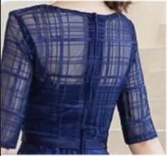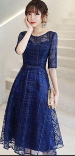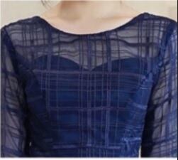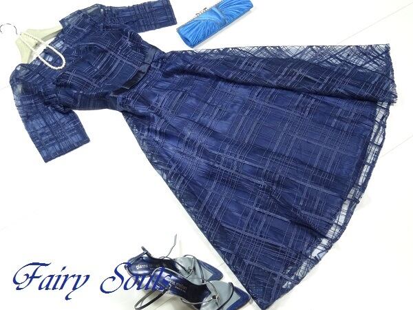 チェック柄レース地のワンピース。綺麗なネイビーのレース地に立体的なチェック柄をほどこしたシックさと優しさを醸し出してくれる魅力的なデザインです。胸元と袖、背中中央までは透け感があり、キュートなセクシー感を演出。優しい感じのワンピ-スです。背中ファスナーあり。裏地付き。胸パッド有り。