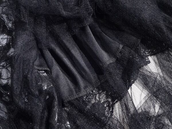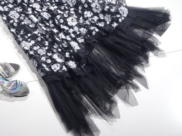 オ-バ-メッシュの超ロングフォ-マルドレスです。白い花柄が美しくスカ-ト裾部分は、レ-スとメッシュで女性らしい柔らかさが表現サイドされています。サイドファスナー有。裏地あり。
