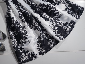 モノト-ンの花が特徴的で美しいシルエットとフレア-がとても可愛いワンピ-スです。艶やかなサテン地で上品でおしゃれな一着です。背中ファスナー有。裏地有り。