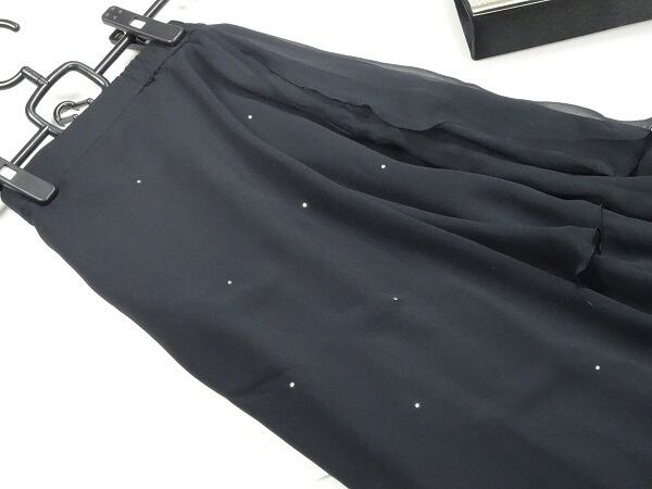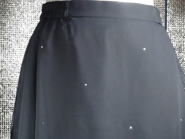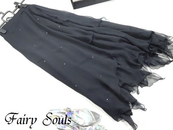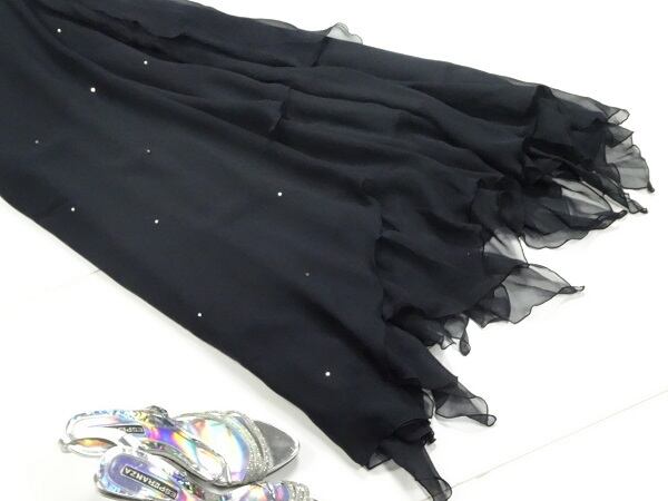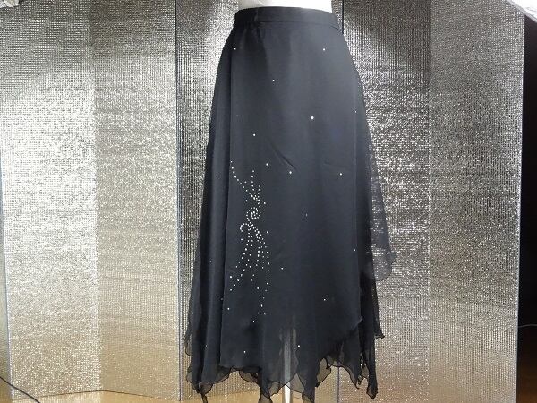 Sanlineのラインスト-ンが施されたスカ-トでウエストはサイドが幅広ゴム仕様でサイズにゆとりがあります。ウエストから裾にかけてフリルが流れるようにあしらわれ豪華な印象に。裾はランダムでとてもエレガントダンスやパーティにひときわ目を引く一着です。後ファスナー有。裏地あり。