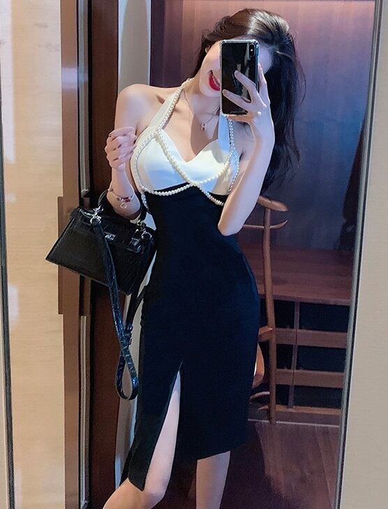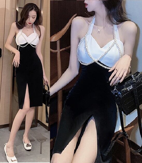 スリット入ホルターネックのワンピース。白と黒の伸縮性のあるジャージ素材を使用。肩紐は首の後ろで結ぶホルターネックタイプ。フェイクパールのネックレスは背中側でサテンのリボンを結んで取り付けます。右裾の深いスリットがセクシーで、夜会など大人の雰囲気に似合う一着です。背中ファスナー。裏地なし。フェイクパールのネックレス付き。