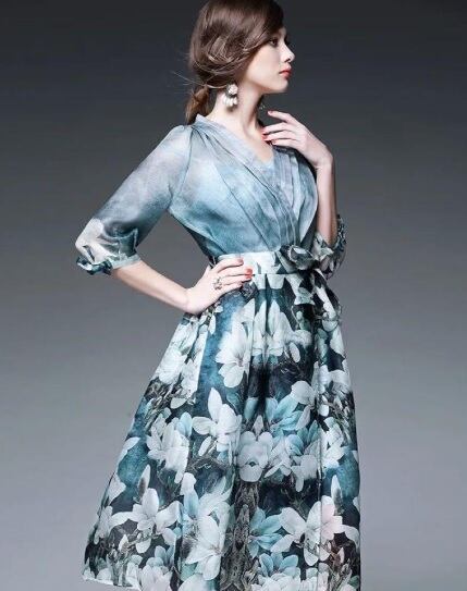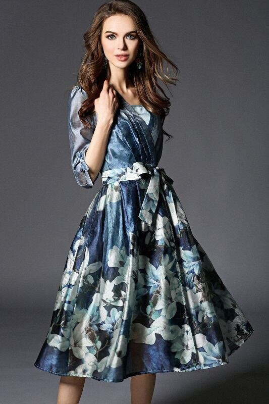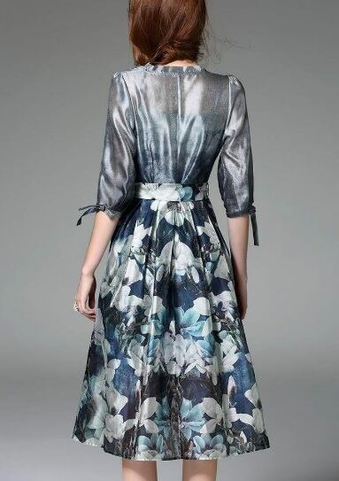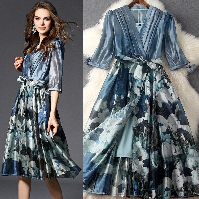 大きな花模様がプリントされたシックなワンピース。トップスは透け感があり、インナーがほんのりと見え、品の良いセクシー感をかもしだしています。袖はリボンがついた七分袖。トップスは細いタックがとられたカシュクール仕様。ウエストを共布のベルトリボンでキュッと絞るデザイン。シックでやさしくエレガントな一着です。ファスナーなし。インナー付。
