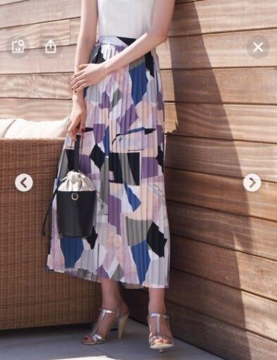 幾何学模様のプリ-ツスカ-ト。シックな色合いの幾何学模様をプリントし、動くたびに足元が美しく揺れるエレガントでお洒落なスカ-トです。プリ-ツがとても綺麗。ウエストはゴム仕様なのでサイズ的にゆとりをもって着用いただけます。女子力UP間違いなしとおもいます。ファスナ-なし(ウエストゴム仕様で伸縮性あり)。裏地あり。