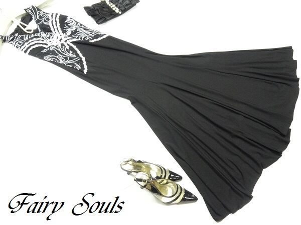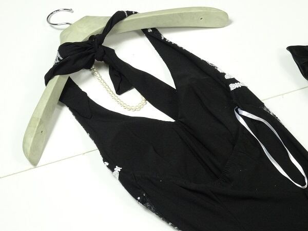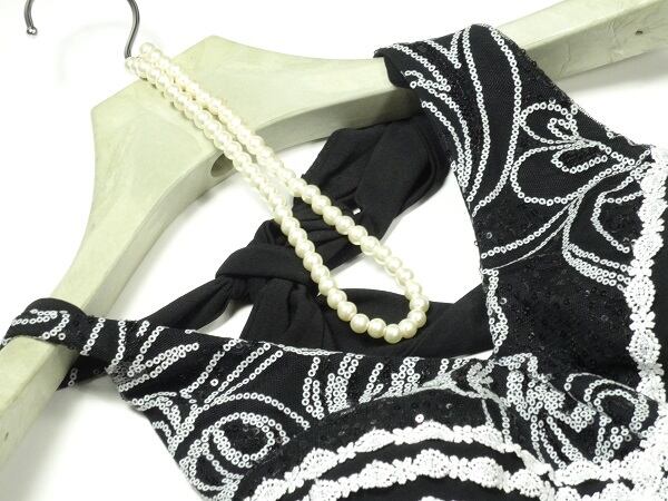 スパンコール飾りホルターネックのドレス。胸元が深いV字に開いていて白のスパンコールとレース飾りがアクセントに。首の後ろで結ぶホルターネックタイプなので背中が美しく見えます。太もものあたりまでは体にフィットするスレンダーのシルエットで、太ももから裾にかけてはゆったりと広がっているので、見た目より動きやすいデザインになっています。パーティやカラオケ、ダンスなどのイベントにも活躍してくれる一品です。裏地なし。ファスナーなしのかぶるタイプ。胸パッド付。