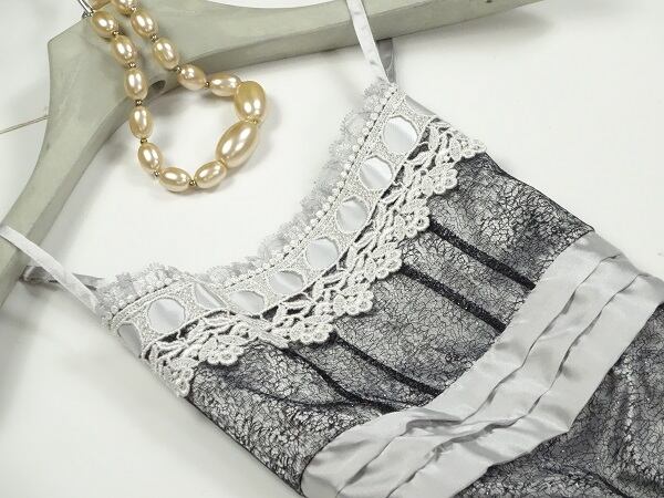 サテン地の上に黒のラメ入りチュ-ル素材を重ねた上質なワンピ-スです。胸元のレ-スがとても可愛く切替のサテンフリルが素敵で大人っぽい色合いで結婚式やパ-ティ-にもお薦めの一着です。背中ファスナーなし。裏地有。