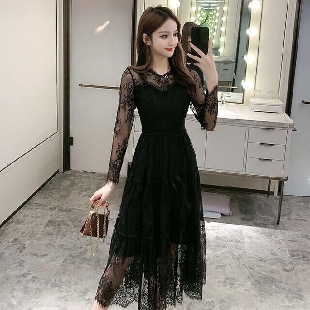 総チュールエレガントなミモレ丈のワンピース。レース刺繍のようにも見える大小の花柄をあしらった黒のネットチュールがエレガントで上品な印象に仕上がっています。胸元と袖はチュールをそのままあしらい、スカート部分は下地が膝までなので、膝から下の足元もほんのり肌の透け感が美しいデザインになっています。ちょっとおしゃれな普段着としても、またフォーマルなシーンにも活躍してくれる、大人の女性を醸し出してくれる一着です。裏地有。背中ファスナ-付。