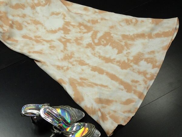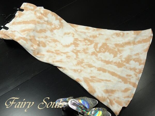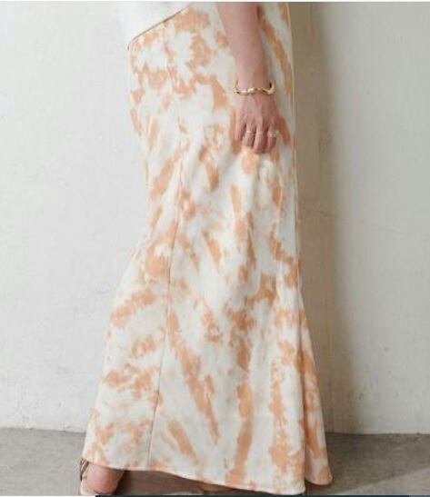 アースカラーのスリムなロングスカート 。ネルのようなしっとりとした生地にアースカラーを流し込んだような模様をプリント。裾までのスリムなラインが足の動きと体の線を美しく見せてくれます。後ろ側のみゴム仕様で若干の伸縮性あり。左脇ファスナー。裏地付。