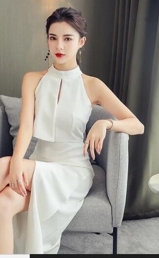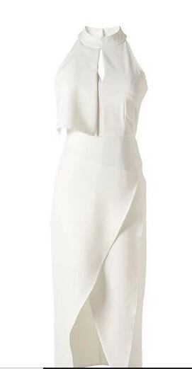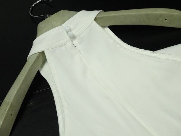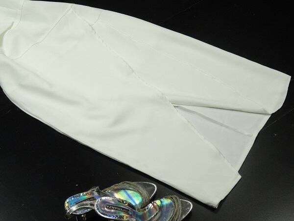 スリット入スレンダーなワンピース。伸縮性のある白のジャージ素材を使用。胸元にはスリットを入れ、前裾は中央で左右の布を合わせて、動くたびに足を大胆に見せ、体の線にフィットしたセクシーでスレンダーなデザインを実現。夜会など大人の雰囲気に似合う一着です。背中ファスナー。裏地あり。