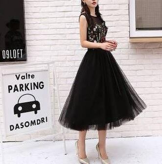 花刺繍ミモレ丈チュ-ルパ-ティ-ドレスです。黒のサテン地の上に、花刺繍をほどこしたチュ-ルが重ねられた豪華でフェミニンなデザイン。デコルテラインの透け感が大人の雰囲気を醸し出し、シックで上品な女性を表現。パーティやイベント、コンサート、結婚式にと、さまざまシーンで活躍してくれる美しい一着。背中網掛け。腰から下ファスナー有。胸パット付。