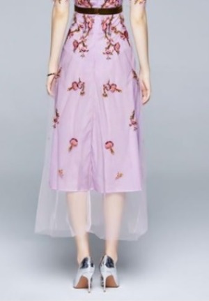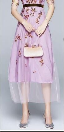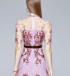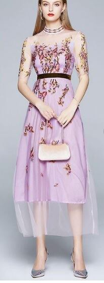 花柄刺繍チュールのワンピース。やさしいラベンダーのチュール地に花柄のレース刺繍をあしらったエレガントで上品な印象のデザイン。下地は同じくラベンダーカラーのジャージ素材で伸縮性があります。ちょっとおしゃれな普段着としても、またフォーマルなシーンにも活躍してくれる、大人の女性を醸し出してくれる一着です。裏地あり。背中ファスナ-有。