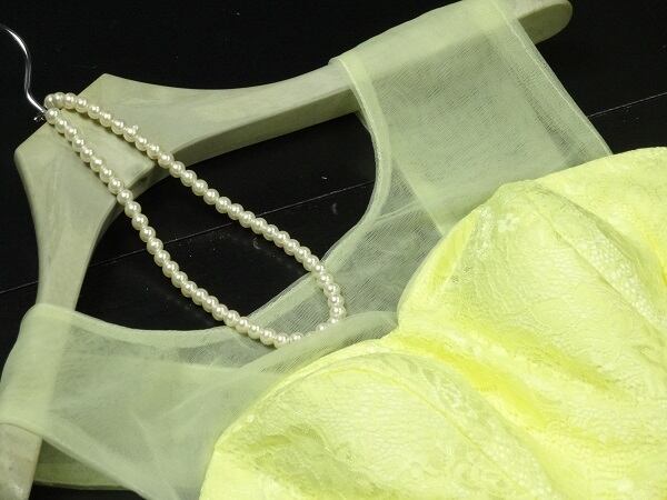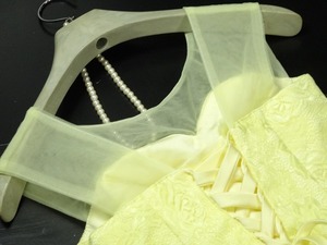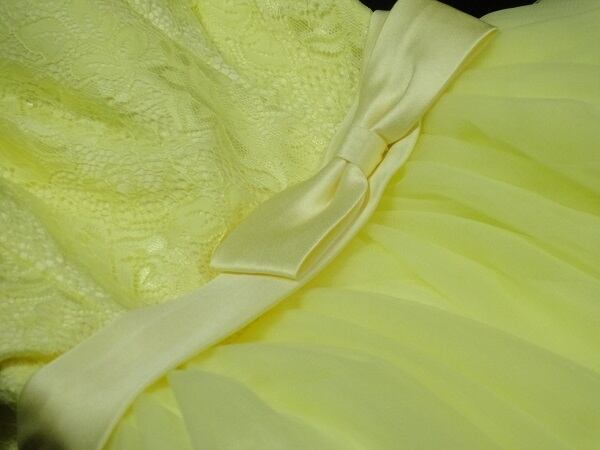ウエストリボンのミニドレス。淡いイエローのサテン地の上にチュールを重ねたかわいいドレス。胸元はレース仕立てで、デコルテラインはチュールのみでほんのり見える肌感がキュートです。ウエストにはサテンのリボンをあしらい、淡いイエローが天使のような可愛らしさを演出しています。パーティやイベント、結婚式など、様々なシーンで、気品のある印象を与えてくれる一枚です。背中は編み掛けなのでバストサイズに若干ゆとりがあります。背中腰から下ファスナ-有。(背中網掛け)。胸パット付。裏地有。輪ゴム付きのミニコサージュ付き。