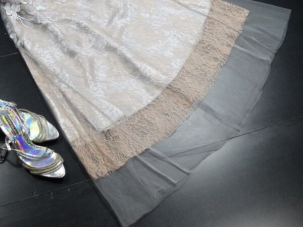 銀糸花柄刺繍チュールのワンピース。上半身はシックなシルバーグレーのサテン地の上に銀糸刺繍を施したチュールを重ね、スカート部分は銀糸刺繡を施したブラウンのチュールをサテン地の上にあしらったエレガントで上品な印象のデザイン。デコルテ部分をチュール地のみにすることで胸元を美しく見せています。フォーマルなシーンにも活躍してくれる、大人の女性を醸し出してくれる一着です。裏地あり。背中ファスナ-有。