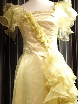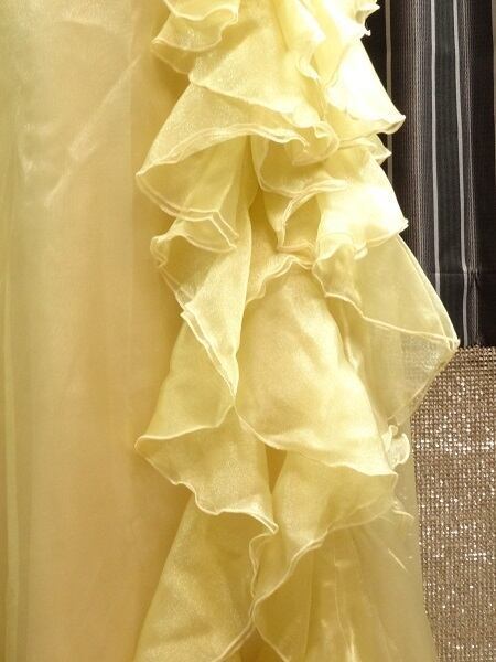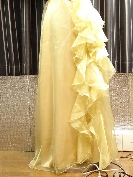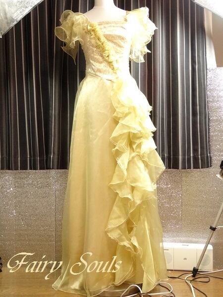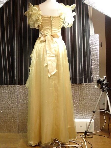 フリルとスパンコールのドレス。落ち着いたゴールドブラウンのサテン地の上に、同色のオーガンジーを重ねています。胸元にはスパンコールをあしらい、右肩から左裾にかけてオーガンジーのフリルを波のようにしつらえ華やかな印象に。袖のフリルも豪華さをアップしてくれています。ウエストのリボンを背中で結んで、華やかさの中にキュートさプラス。パーティやイベント、コンサート、結婚式にと、さまざまシーンで活躍してくれる美しい一着。背中ファスナー。裏地付。※ウエストリボンは縫い付けてあって取り外し不可。