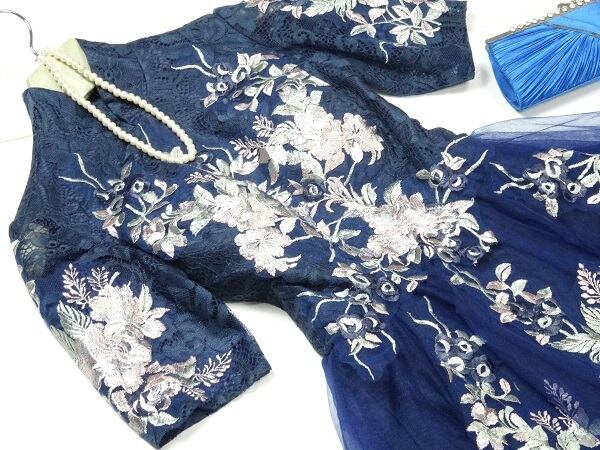 チャイナ風刺繍が美しいワンドレスです。ネイビーカラーのサテン地の上に刺繍を施したチュールを重ねています。袖までしっかりと刺繍が施され、きりっとした立て襟が魅力的なデザイン。大人の魅力を醸し出してくれています。パーティや結婚式の二次会、コンサートなど、フォーマルなシーンで活躍してくれる一着です。裏地なし。背中ファスナ-有。胸パッド付。