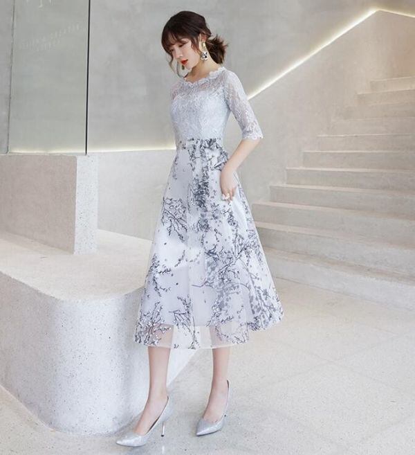 チュ-ルレースミディアムパ-ティ-ドレスです。トレンド感たっぷり色の美しいエレガントなワンピ-スです。ハイウエストのリボン切替で脚長効果のあるデザイン性のあるスタイルがとても魅力的な一着です。全体的に女性度UPに仕上げられています。背中ファスナ-有。胸パット付き。裏地有。