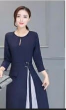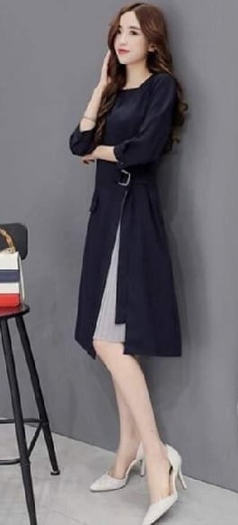 ジャージー素材プリーツ見せのワンピース。紺のジャージー素材で伸縮性があり、スカート部分は左側にグレーのシフォンのプリーツをあしらってアクセントにしています。動くたびにシフォンがちらちらと見えて、ユニークで品の良いデザインになています。普段使いから、ちょっとおしゃれに、さまざまなシーンで活躍してくれる一着です。背中ファスナー。裏地あり。
