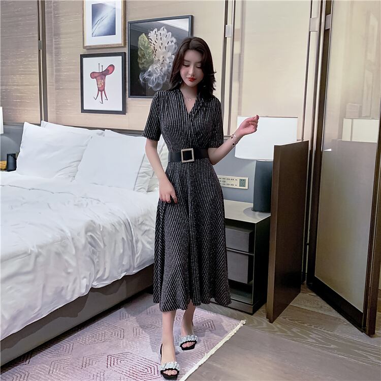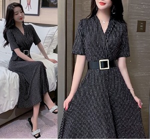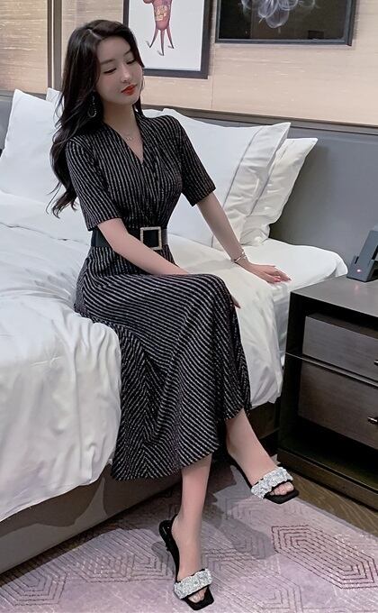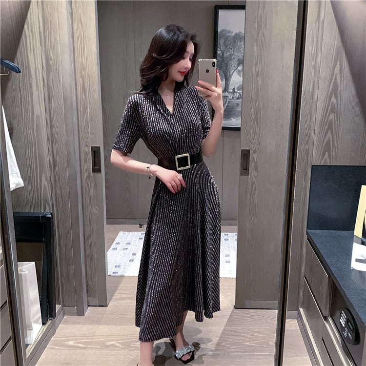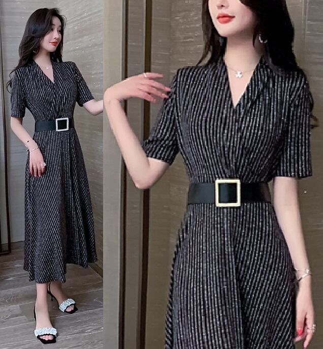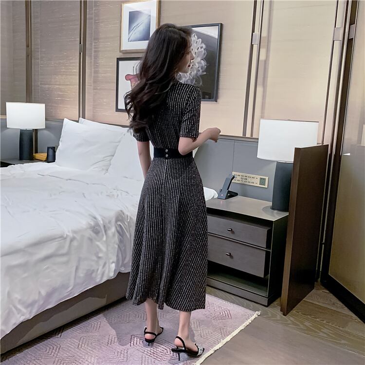 ラメ入りニット素材のワンピース。胸元はカシュクール風。縦にラメを入れ、シンプルなシルエットにアクセントをプラス。大きなベルトでフォーマル感を演出しています。ニット素材なので伸縮性があります。エレガントで優しい印象を与えてくれる一着。デート、お呼ばれ、パーティ、コンサート、結婚式にと、さまざまなシーンに活躍してくれます。ファスナーなしのかぶるタイプ。裏地有。
