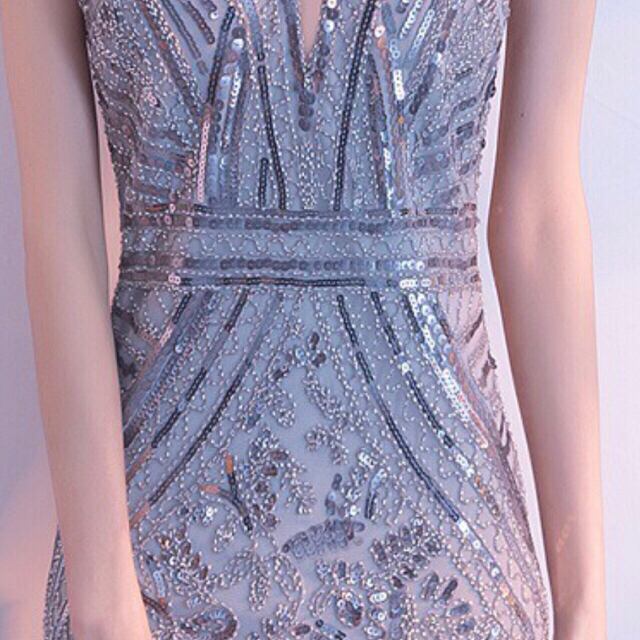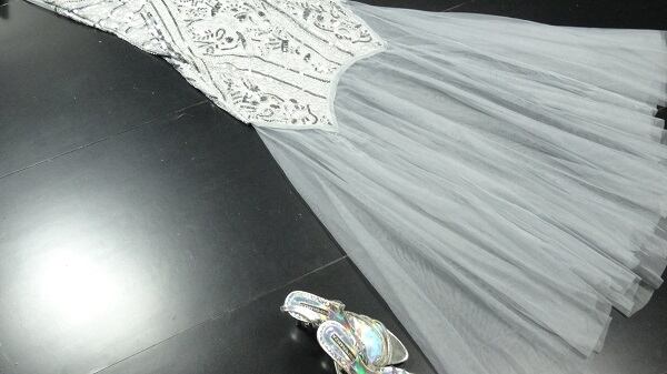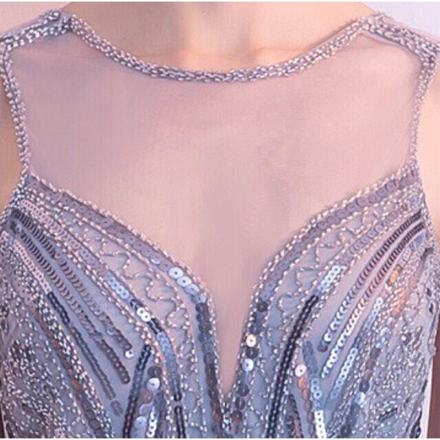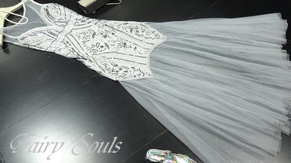 チュールとスパンコールのマーメイドドレス。シックなグレーのチュール地に大小のスパンコールとビーズを銀糸であしらったゴージャスなデザイン。胸元と太ももから足先にかけてはチュールのみの透け感が美しく、くびれたウエストとマーメイドラインがセクシーさを醸し出しています。パーティやライブ、イベントなど華やかなシーンに。デザイン上伸縮性はそれほどなく体のラインにフィットしたシルエットです。背中ファスナー有。トップス部分のみ裏地あり。