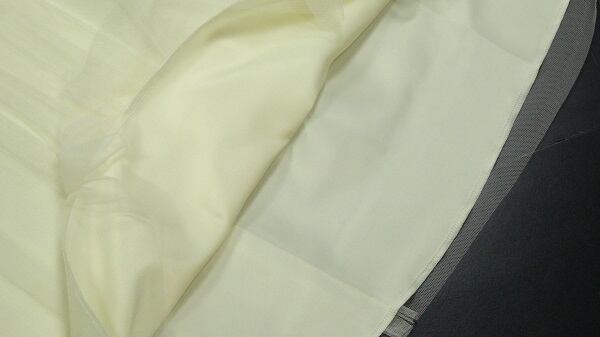 チュール袖フリルのパ-ティ-ロングドレス。レモンイエローのサテン地の上に同色のチュールを重ねて豪華な雰囲気に。トップス部分はチュール地に刺繍をあしらい、袖はチュールを肩からかぶせた広がるデザインになっており、腕をカバーし、また背中部分がシャーリング仕様になっているので、伸縮性があり動きやすくなっています。パーティやイベント、結婚式など、様々なシーンで、気品のある印象を与えてくれる一枚です。裏地なし(サテン地の上にチュールをかぶせています)。背中シャーリング仕様。右脇ファスナ-有。胸パット付き。