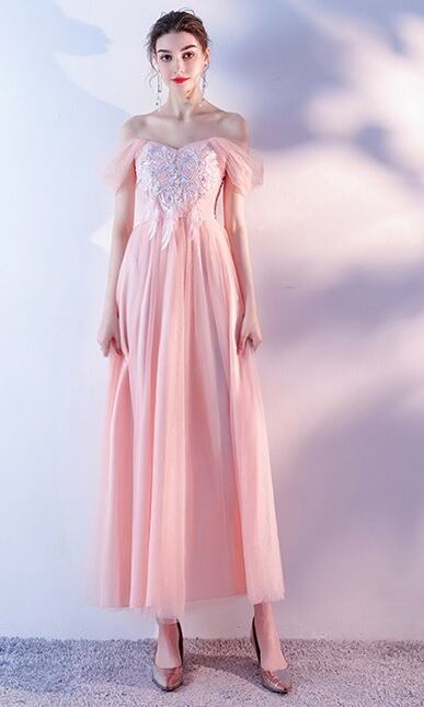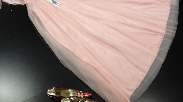 チュールオフショルダーのパ-ティ-ドレス。ピンクのサテン地の上に同色のチュールを重ねて豪華な雰囲気に。トップス部分はチュール地に刺繍とビーズパールをあしらい、袖はチュールをドレープ状にたばねたオフショルダータイプ。デコルテから肩にかけてのラインが美しくみえるデザインです。また背中部分がシャーリング仕様になっているので、伸縮性があり動きやすくなっています。パーティやイベント、結婚式など、様々なシーンで、気品のある印象を与えてくれる一枚です。裏地なし(サテン地の上にチュールをかぶせています)。背中シャーリング仕様。右脇ファスナ-有。胸パット付き。