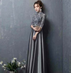 レース切替サテンロングドレスです。気品に満ちたとてもエレガントで上品なひとクラス上をいく一品です。トップス部分は花刺繍が施されたレースがサテン地に重ねられ豪華かつ上品でエレガントなドレスです。背中ファスナ-有。裏地有。胸パット付き。