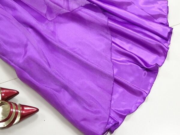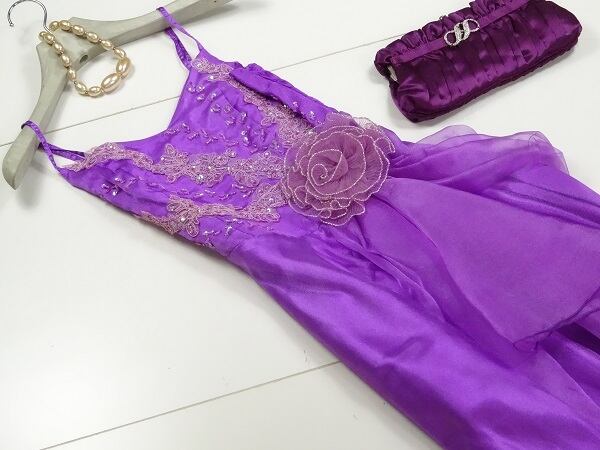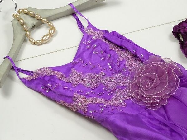 "胸元には大胆に斜めに刺繍が施され、ウエスト部分の大きな花のコサージュが全体を引き締めています。スカート部分は生地が重ね合わさり、ボリューム感があります。パープルの色が鮮やかなドレスです。