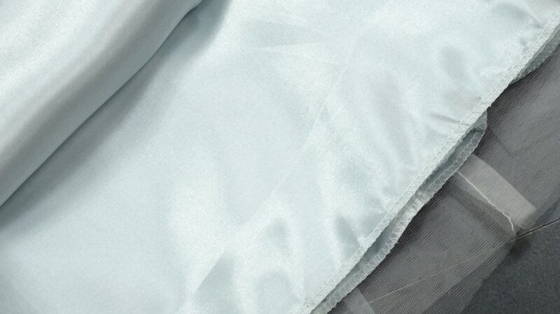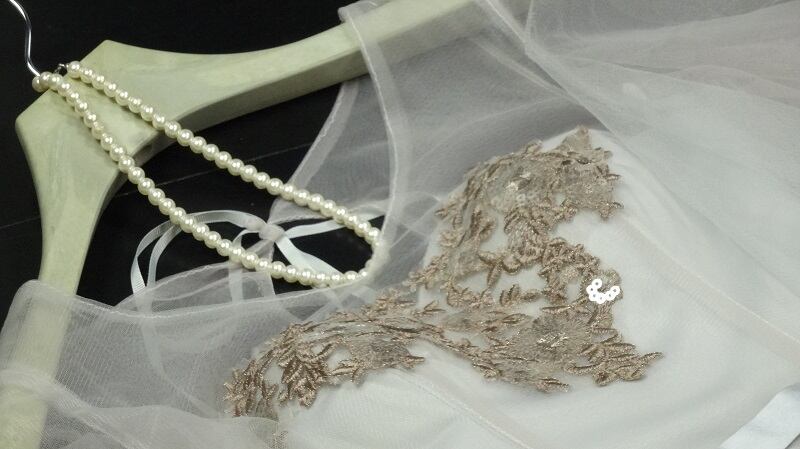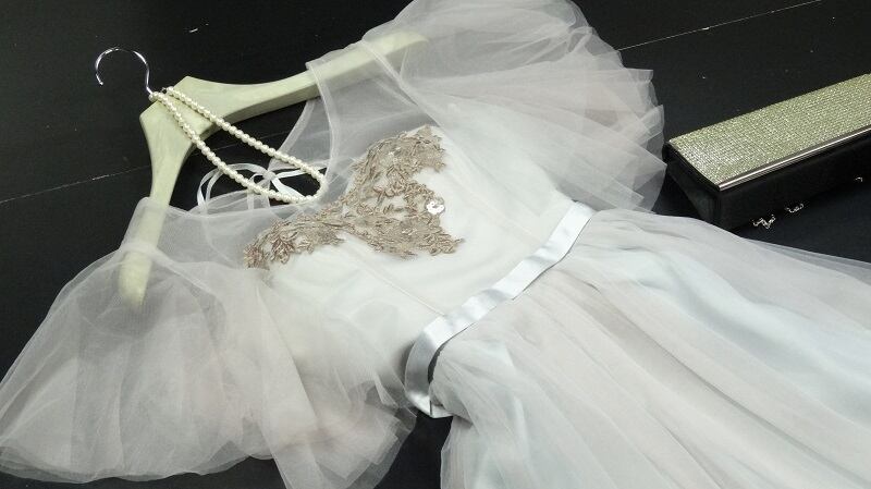 胸元立体刺繍チュール膝丈ドレスです。サテン地に同色のチュールをかぶせたエレガントなデザイン。袖は肩をみせて二の腕からフリル仕様になっています。胸元はブラウンの立体刺繡が施されとても豪華です。パーティやイベント、結婚式など、様々なシーンで、気品のある印象を与えてくれる一枚です。背中網掛け。背中腰下ファスナ-有。胸パット付。裏地有。