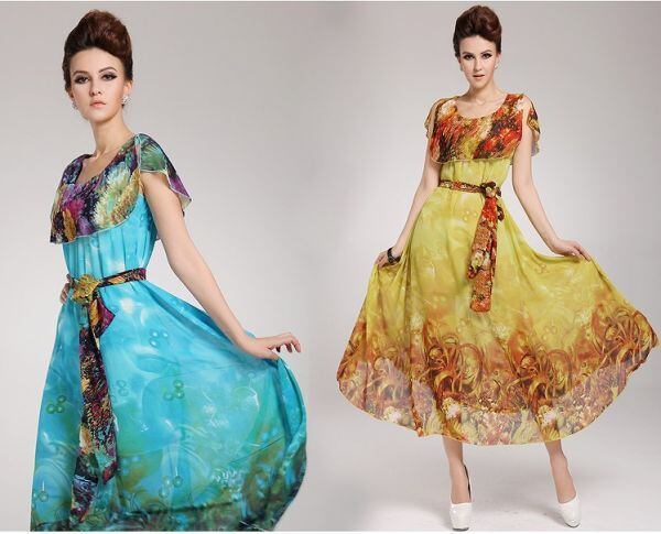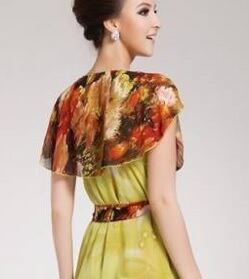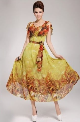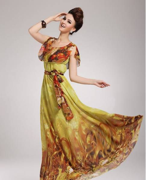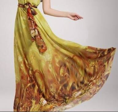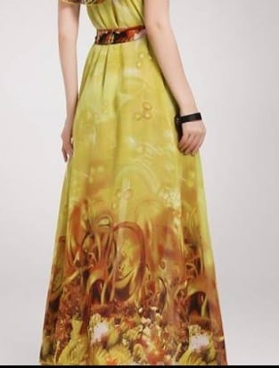 黄色と赤色のロ-マ風ロングワンピ-スです。ウエストはゴムになっていて共布ウエストリボンがついています。エレガントで優しい印象を与えてくれる一着。デート、お呼ばれ、パーティ、コンサート、結婚式にと、さまざまなシーンに活躍してくれます。ファスナーなし。裏地あり。