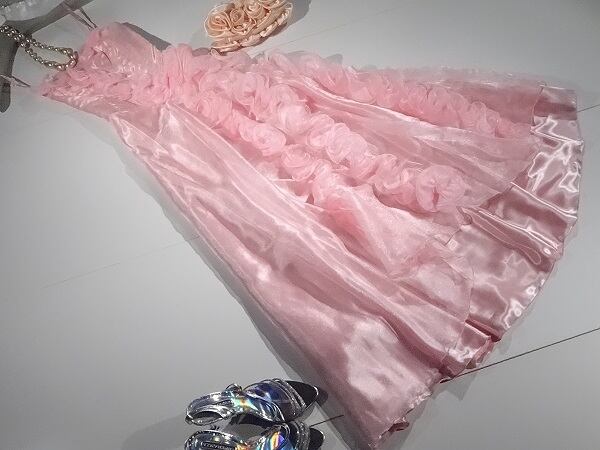 "胸元からウエスト、ドレスの裾にかけてたっぷりとした飾りがほどこされたとっても可愛い感じのドレスです。