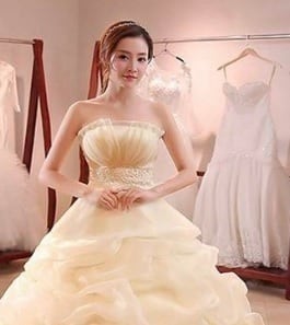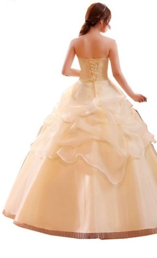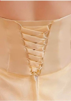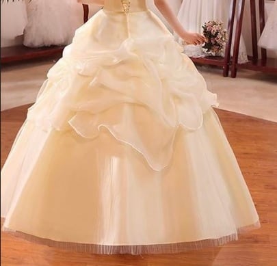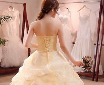 フリルとチュールのウエディングドレス。たっぷりとしたレモンイエローのサテン地にプリーツ加工をほどこしたチュールを重ねたデザイン性のあるスタイルがとても魅力的です。ベアタイプで胸元の立体刺繍とウエストからヒップにかけてのオーガンジーのフリルが豪華かつ上品で全体的に優しい感じに仕上げています。背中は編紐で縛る形なので、若干サイズに幅をもって着て頂けます。背中編み紐掛け。腰下ファスナ-有。胸パット付き。