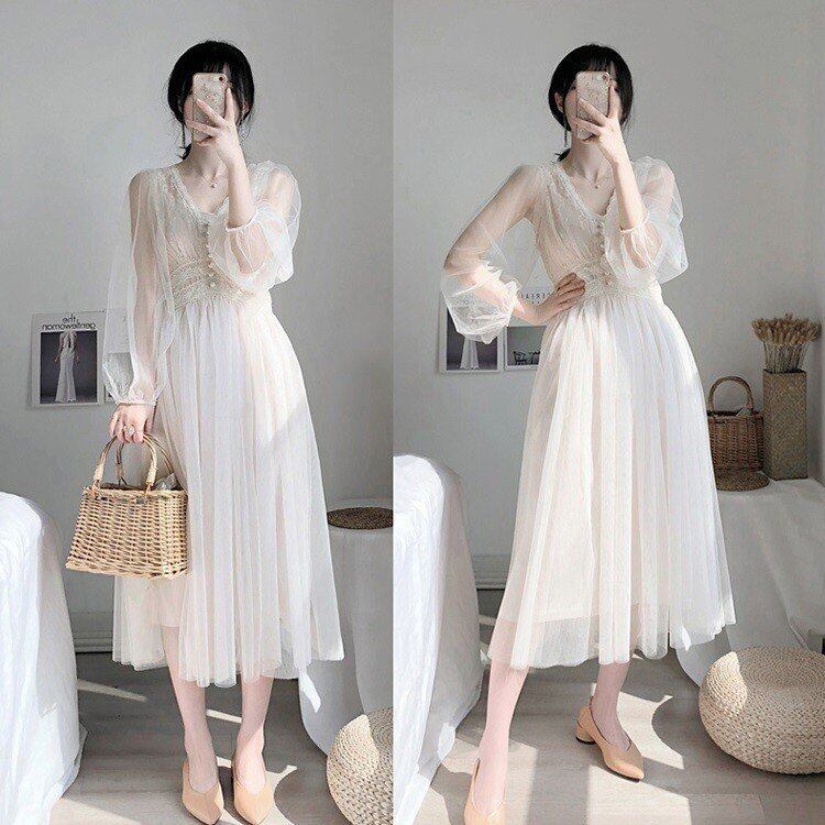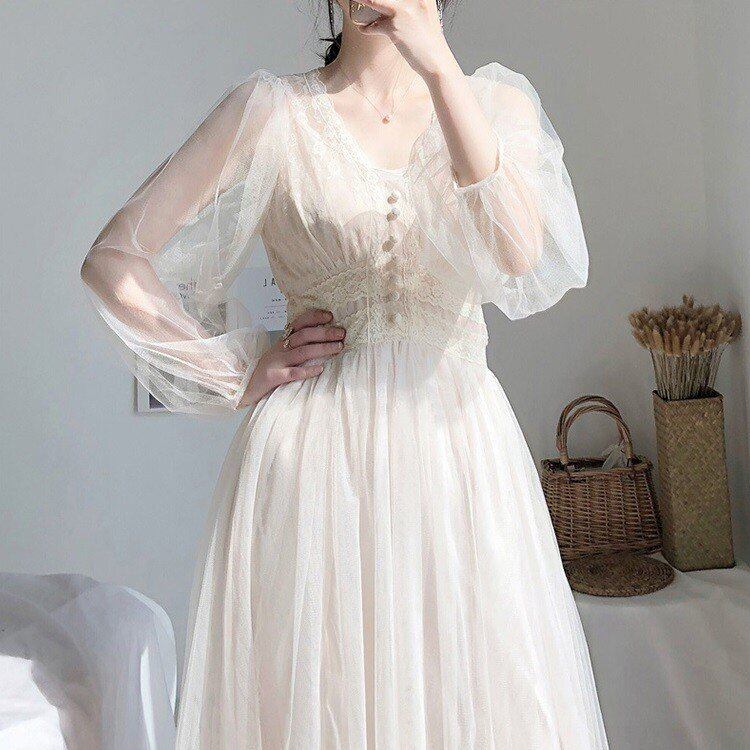 インナー付き2枚重ねチュールの長袖ワンピース。淡いクリームカラーのチュールをふんだんに使用。フロント部分にはフェイクパールの飾りボタンを配しアクセントに。袖の透け感とデザイン性のあるスタイルがとても魅力的な一着です。インナー付き。右脇ファスナ-有。