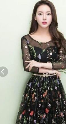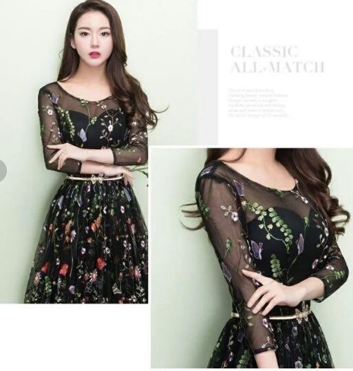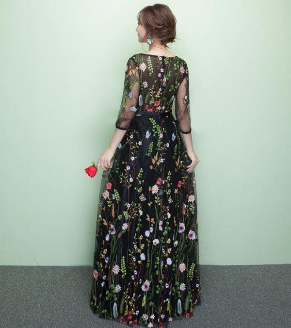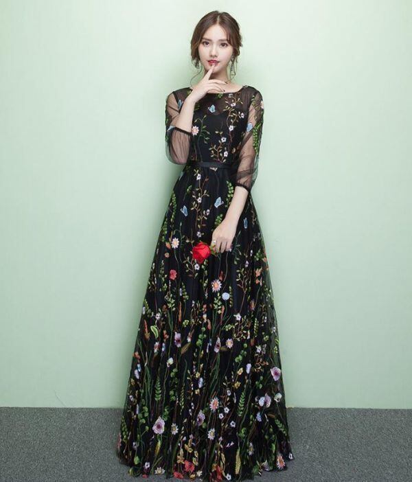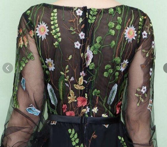 トレンド刺繍花柄チュ-ルロングドレスです。黒のサテン地の上にトレンド感たっぷり色の美しい立体刺繍が施されたチュ-ルが重ねられたとてもエレガントなドレスです。デザイン性のあるスタイルがとても魅力的で着心地の良い一着です。大人のデザインで全体的に優しい感じに仕上げられています。背中ファスナ-有。胸パット付き。
