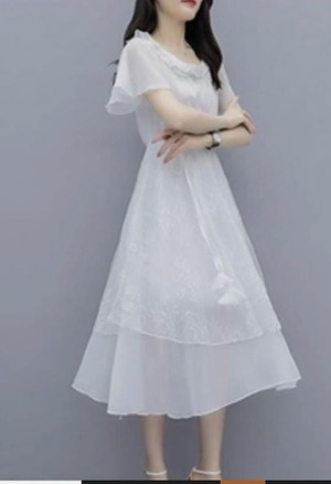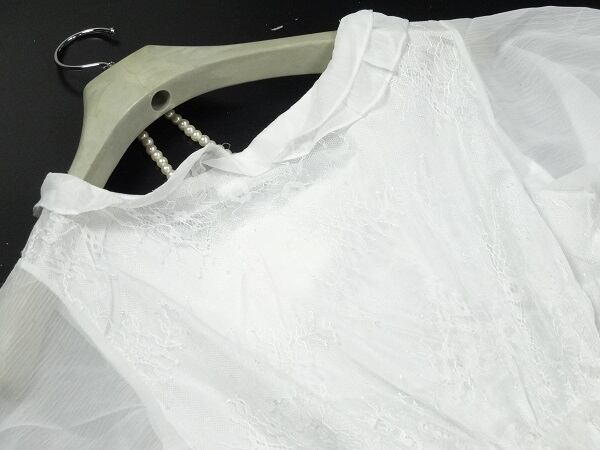 シフォンとレースのワンピ-ス。ピュアホワイトのレースをしなやかなシフォン地に重ねた美しい一着。袖は季節長めに着られる半袖タイプ。ウエストは総ゴム仕様でサイズ的にゆとりをもって着用いただけます。かわいい紐のウエストリボンがアクセントに。ボリュームを出し華やかな印象の、品の良いセクシー感をかもしだしているシックでやさしくエレガントな一着です。ファスナーなしのかぶるタイプ。裏地有。