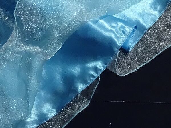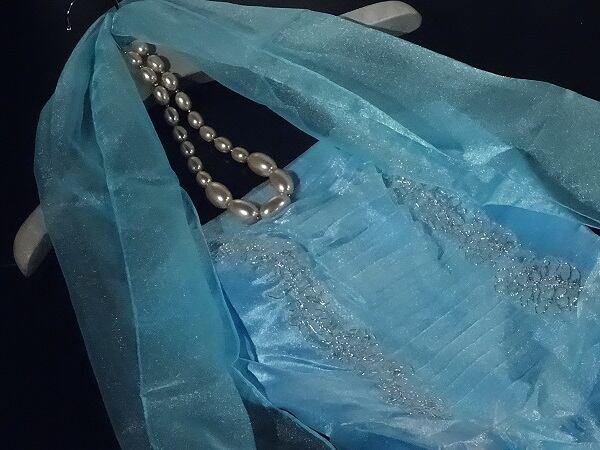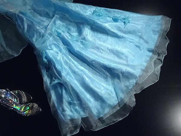 爽やかなブルーオーガンジーのドレス。胸元はオーガンジーの横タックプリ-ツで縦に銀刺繍をほどこしています。ところどころにモチーフを配し、下地につまみ留めして立体的なラインをつくりボリューム感をだしています。さわやかで豪華なデザイン。パーティ、イベント、結婚式の二次会、コンサートなど幅広いシーンで活躍してくれる一着です。オーガンジーのストール付。肩紐調整不可。胸カップ仕様。背中ファスナー。裏地あり。
