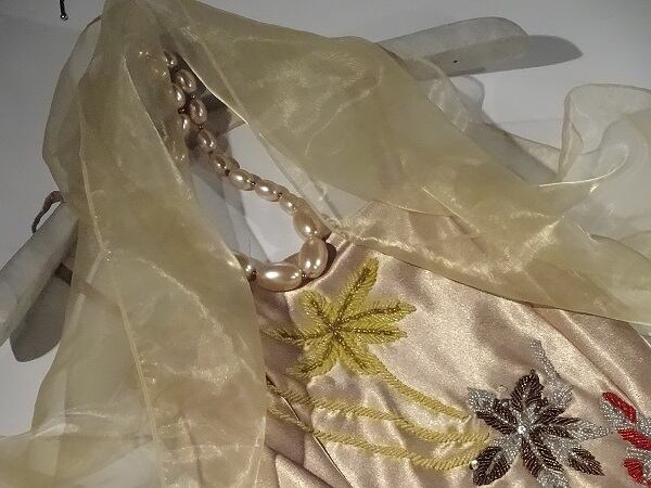 胸元の刺繍ビ-ズ飾りがとても豪華なサテンドレスです。スト-ル付き。裏地有り。ファスナ-無し。肩紐調整不可。