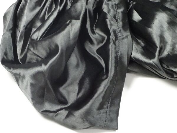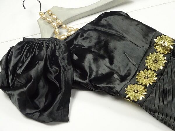 上品さと優雅さがあり、最高に女性らしいイメ-ジを与えてくれる好感度の高いドレスです。トップス部分はプリ-ツデザインになっています。黒のやわらかなサテン地で、胸下の金刺繍がとても豪華で着る人の魅力を存分に引き出してくれます。右サイドファスナー有。裏地なし。