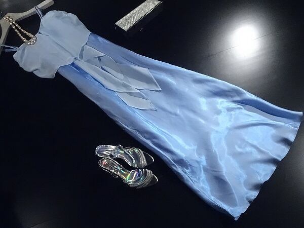 胸元部分はサテン地にオ-ガンジ-の生地を重ねた素敵なロングドレスです。
