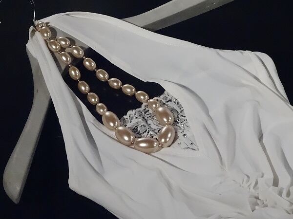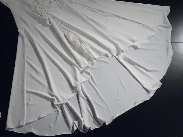 ラインスト-ンフロントシャ-リングのドレスです。裾は前が短く後ろが長いエレガントな作りになっています。ファスナ-無し。裏地なし。