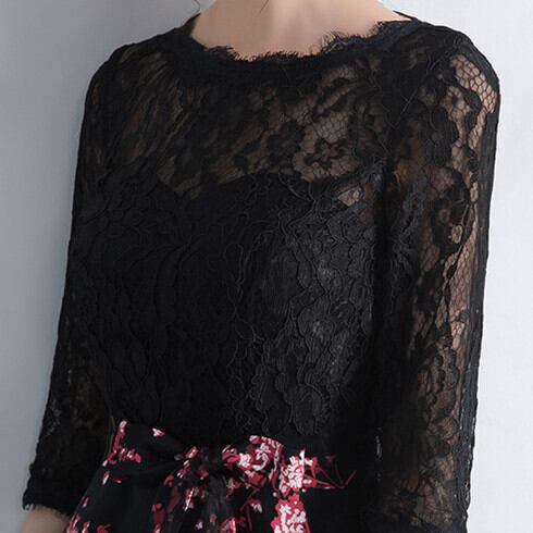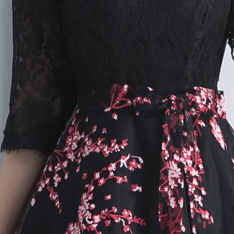 ネットチュールのパーティロングドレス。トップス部分は黒のネットチュールに細かな模様を編み込み、ウエストから裾までは艶のある赤と白の小花をプリントしたネット地をふんだんに使用し、流れるようなデザインがとても綺麗なスタイルを醸し出してくれています。全体的に優しい感じに仕上げられています。背中ファスナ-有。裏地有。胸パッド付。