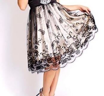花柄刺繍のチュ-ルとサテンのベアタイプのミニドレスワンピース。胸もとには黒の布でつくった花モチーフにフェイクパールをあしらい、ウエストは黒のサテン地の中央におおきなビジュー飾りがきらきらと輝いていてかわいい印象に。スカート部分は前と後ろの長さが違うフィッシュテールタイプで、シャンパンゴールドのサテン生地に黒のチュールをあわせエレガントに。シックで上品な中にキュートさをあわせもったデザイン。お呼ばれ、結婚式の二次会、デ-トなど特別なシーンやパーティーに最適です。背中部分はゴムのシャーリング仕様になっているので、サイズ的にゆとりをもって着用頂けます。左サイドファスナー。裏地あり。透明な着脱可能な肩紐付き。胸パット付き。