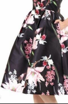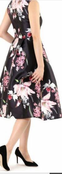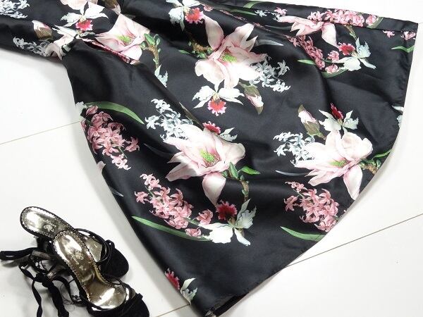 サテン花柄ボタニカル柄のワンピ-ス。黒地に大きな花模様を大胆にプリント。クラシックなスタイルが優雅な女性らしさを香らせ、合わせる小物で印象を変えることが可能な、シンプルな飽きのこない着まわせる一着です。裏地あり。背中ファスナ-有。