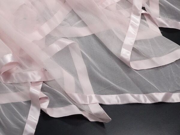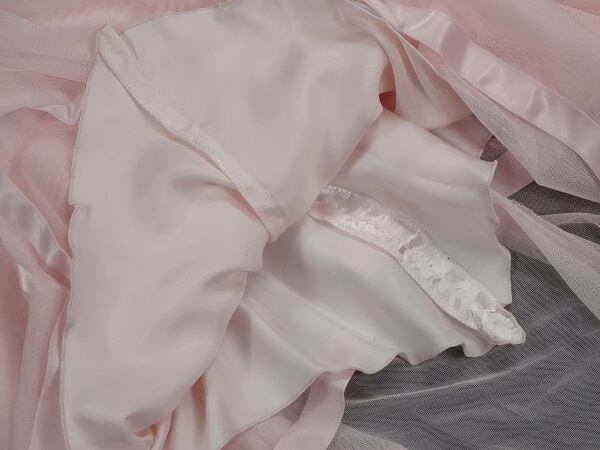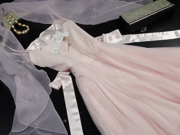 ピンクのキュートなドレス。シンプルなラインのトップスと、ウエストから裾までのランダムカットのコントラストが美しいデザイン。着る人の魅力を十分に引き出してくれる一着です。裏地あり。肩紐調整可。