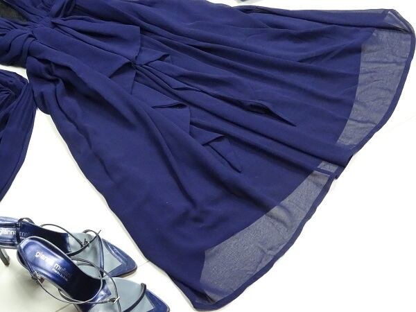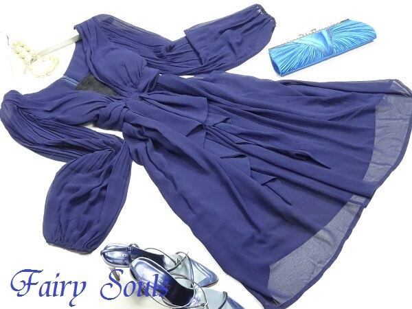 シフォン素材で袖はグラデ-ションプリ-ツの長袖パ-ティ-ワンピ-スです。切替のウエストリボンは調整可。胸元の黒レ-スがとてもエレガントです。大人っぽい色合いで結婚式やパーティーにもお薦めの一着。背中ファスナー有。裏地有。パット仕様。