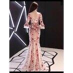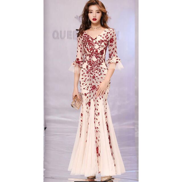 チュールとスパンコールのマーメイドドレス。落ち着いたベージュのチュール地に鮮やかな赤のスパンコールをふんだんに使用した豪華なデザイン。袖先と裾先はチュールが広がり、くびれたウエストがセクシーさを醸し出しています。パーティやライブ、イベントなど華やかなシーンに。デザイン上伸縮性はそれほどなく体のラインにフィットしたシルエットです。背中ファスナー有。裏地なし(ジャージ素材の下地にチュールをかぶせています)。