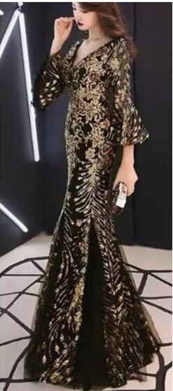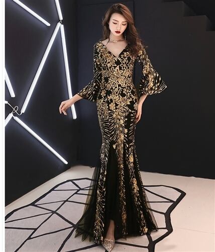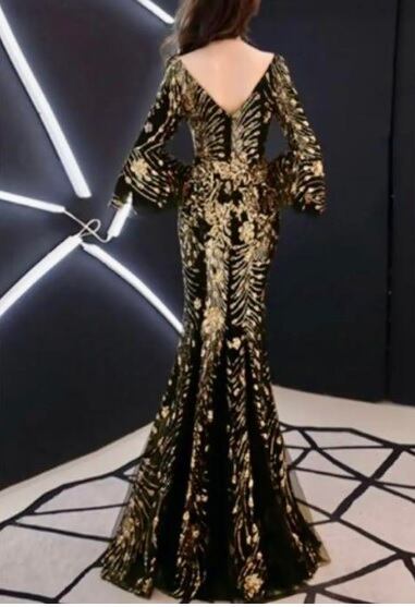 チュールとスパンコールのマーメイドドレス。落ち着いたベージュのチュール地に鮮やかな金のスパンコールをふんだんに使用した豪華なデザイン。袖先と裾先はチュールが広がり、くびれたウエストがセクシーさを醸し出しています。パーティやライブ、イベントなど華やかなシーンに。デザイン上伸縮性はそれほどなく体のラインにフィットしたシルエットです。背中ファスナー有。裏地なし(ジャージ素材の下地にチュールをかぶせています)。