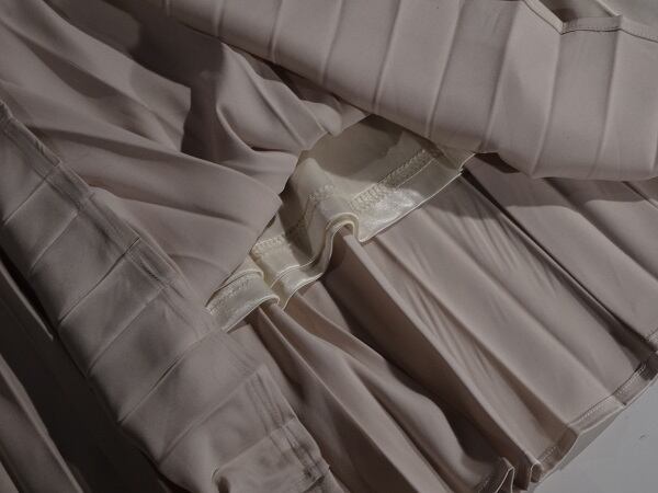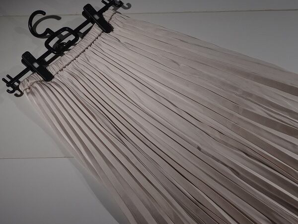 大胆に生地を使い細かいプリーツが上品なロングスカートです光沢感がありベ-シックなデザインですが女性らしさUP!。ウエストはゴム仕様でゆったりと着て頂けます。風に優しくなびき、歩くたびに着る人の足元を美しく見せてくれる一着です。裏地付。