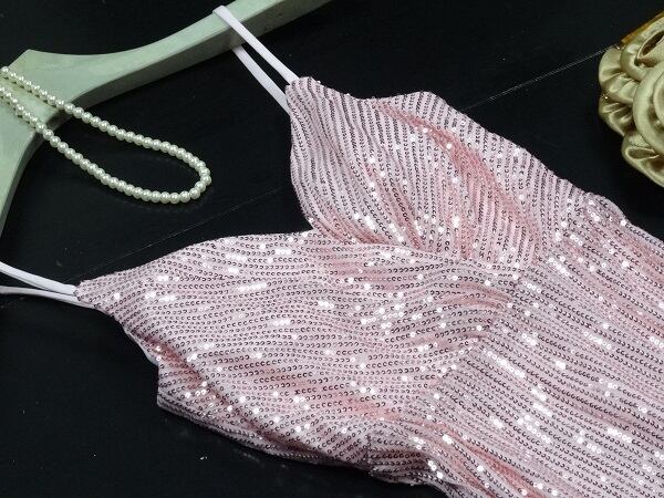 スリット入りスパンコールのパ-ティ-ドレス。左サイドには太ももからすそにかけて大きなスリットを入れ、胸元は胸の形に沿ったセクシーなフォルム。ピンクのネットチュールには全体に金のスパンコールをふんだんにあしらい豪華ではなやかな印象に。パーティやイベントなど、様々なシーンで、魅力的な印象を与えてくれる一枚です。裏地あり。背中ファスナーあり。左サイドのスリットは裾から上に約68cm位。胸パット付き。肩紐は調整不可。